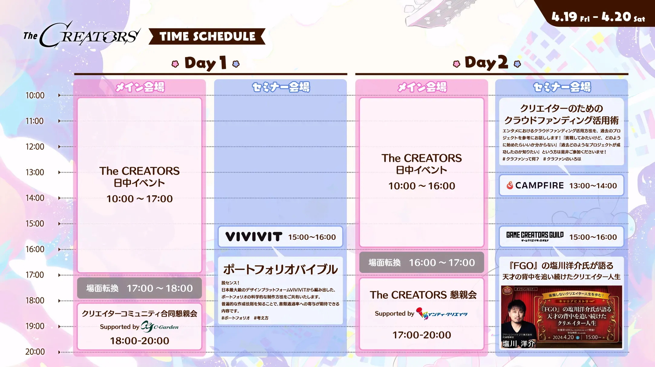 これまでの実施経験から、懇親会の他にも様々、クリエイターのためになるイベントがつくれるのでは、という想いから、今回、出張編集部やクリエイターコミュニティのブース、クリエイター対談を含むセミナーといった多彩なプログラムを用意し、クリエイターの皆さまにとって価値ある経験となることを目指して企画をしてまいりました。