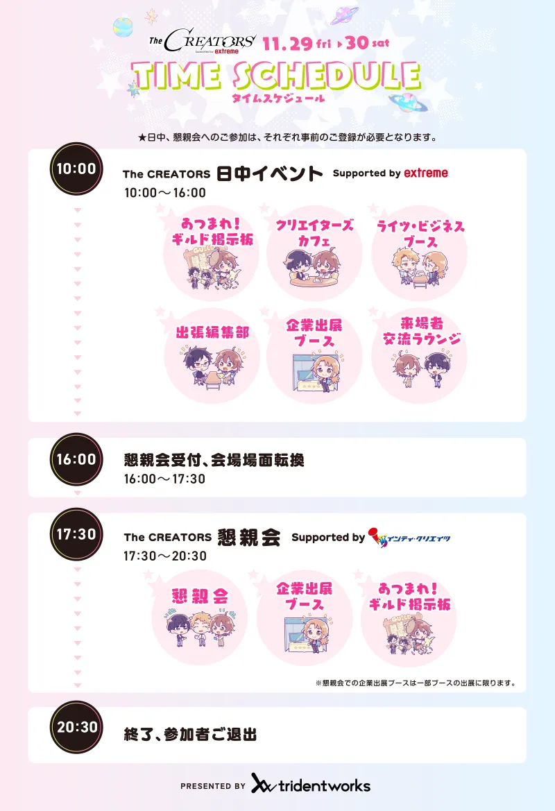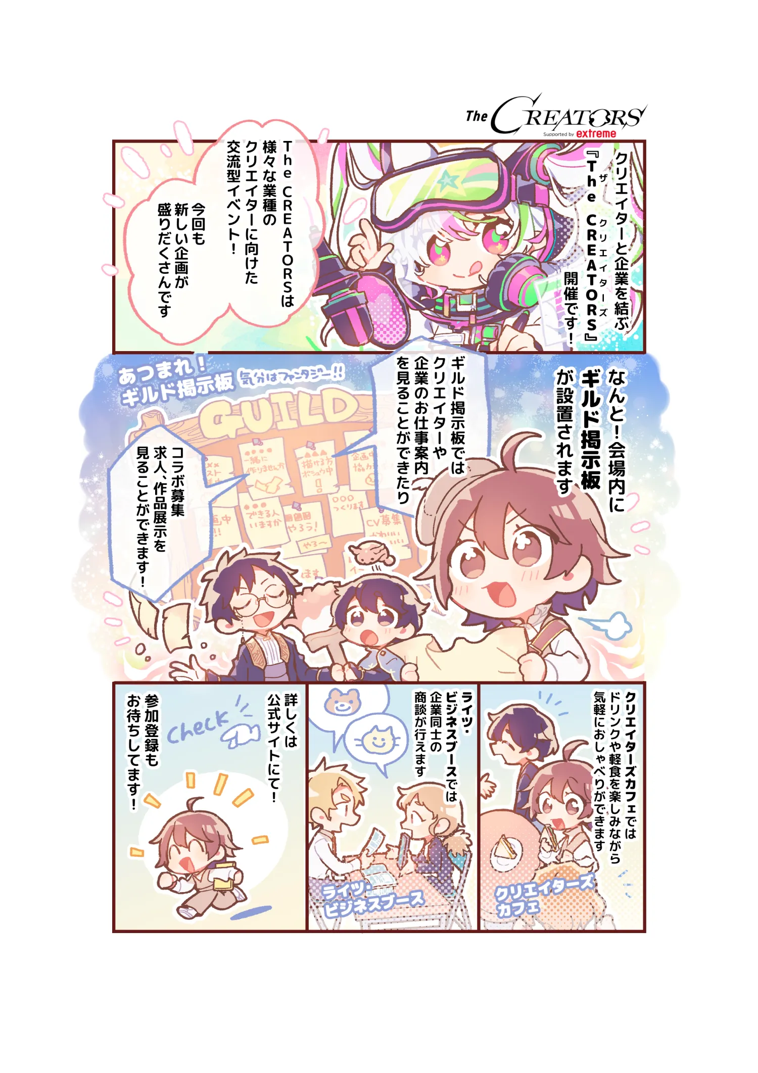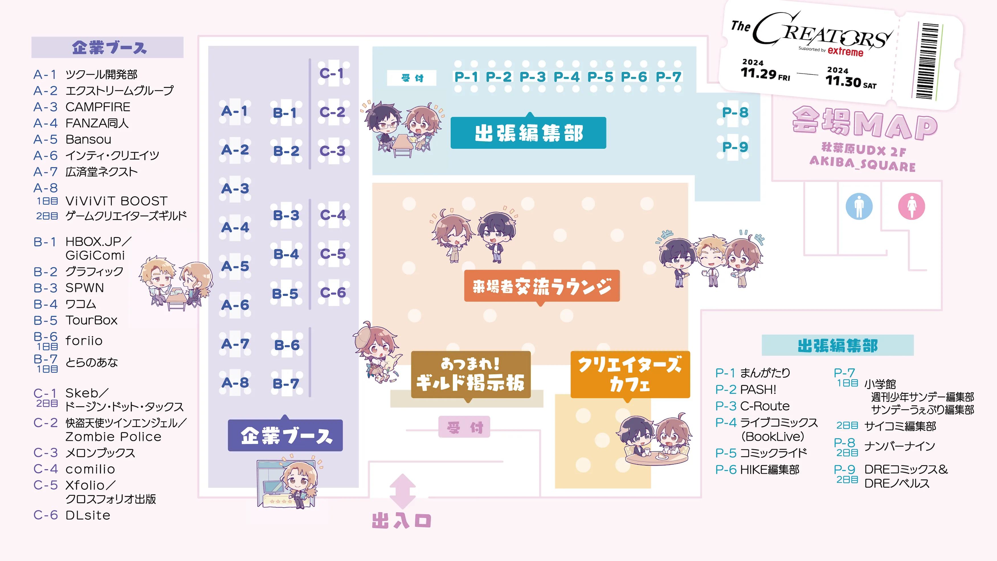これまでの交流ラウンジ、企業ブース、出張編集部といった施策の他、今回から新たに最新案件や自己紹介などが見られるギルド掲示板やクリエイターズカフェ、BtoB向けのライツ・ビジネスブースなど、今回も多彩なプログラムを用意し、クリエイターの皆さまにとって価値ある経験となることを目指して企画をしてまいりました。